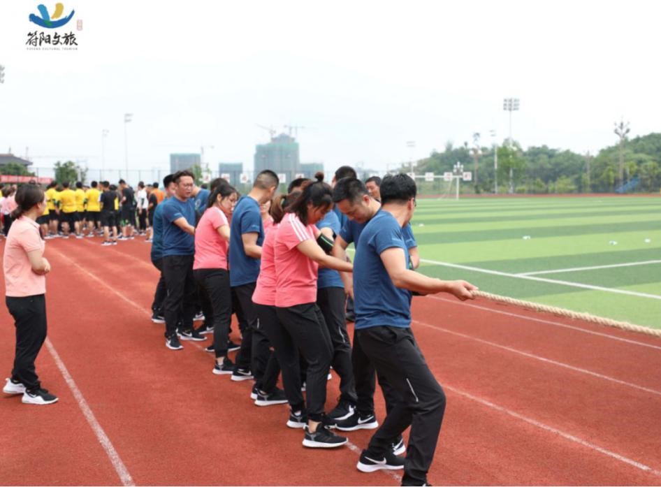 隨著哨聲一響,我們雙手握緊長繩,咬緊牙關(guān)向后拉,為了把握節(jié)奏形成合力,心里默念著“一二、一二”,場上一時僵持難下,但難敵強悍對手,第一局廣源達勝。這仿佛符合多數(shù)人的預(yù)期,但我們怎會被拘于這固定印象,越戰(zhàn)越勇才是符陽文旅人的風(fēng)姿。第二場對決比第一場更加艱難,一開場廣源達占據(jù)絕對優(yōu)勢,我們險被拉到了終線,全憑一口氣死撐,牙關(guān)咬緊,身體后傾,不斷降低重心,腳步穩(wěn)扎,做著別人眼里無畏的掙扎。一定不能越線!在超高壓下堅持了十余秒,那一刻拼的就是韌勁!一群瘦弱的文旅人憑著一股拼勁慢慢把賽場主動權(quán)掌握在了自己手中,每向后移動一步,心里的勁更足了,如荒漠迷路的旅者遇見了綠洲,我們也尋得了力量之源。當(dāng)現(xiàn)場歡呼聲響起時,我們已癱坐一片,不敢置信,我們贏啦!