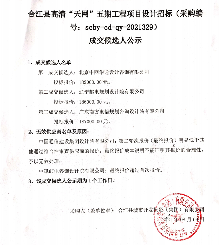 合江縣高清“天網(wǎng)”五期工程項目設(shè)計招標(biāo)成交候選人公示