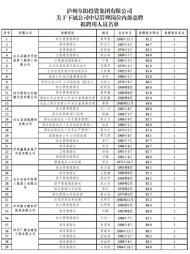 根據(jù)《瀘州williamhill威廉希爾集團(tuán)有限公司關(guān)于下屬公司中層管理崗位內(nèi)部競聘工作的公告》(瀘阜投發(fā)〔2020〕21號)的規(guī)定,經(jīng)威廉希爾集團(tuán)黨委會研究決定,擬聘用唐琿蔓等39人為瀘州williamhill威廉希爾集團(tuán)有限公司下屬公司中層管理人員?,F(xiàn)面向社會公示7日,公示時間2020年6月19日至2020年6月25日。公示期間,如有問題,請及時向瀘州williamhill威廉希爾集團(tuán)有限公司組織與人力資源管理部反映。要求舉報者署實名,實事求是地反映問題,并提供必要的調(diào)查線索。